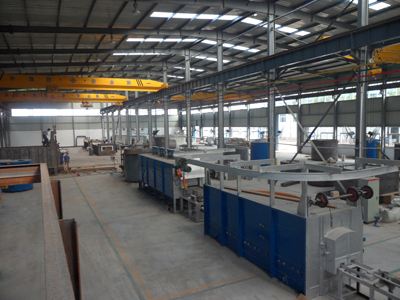 臺車式退火爐鋼 結構主要包括爐殼支撐框架和驅動設備支撐框架(平臺鋼結構)??紤]到爐殼潛在的熱脹冷縮因素,各段爐殼支撐框架與平臺鋼結構采川相互獨立結構。各爐段的底 輥室先安裝就位,以自己四角立柱為基準完成4個基準立柱焊接;再焊接左右兩個整體端板.而操作側和傳..